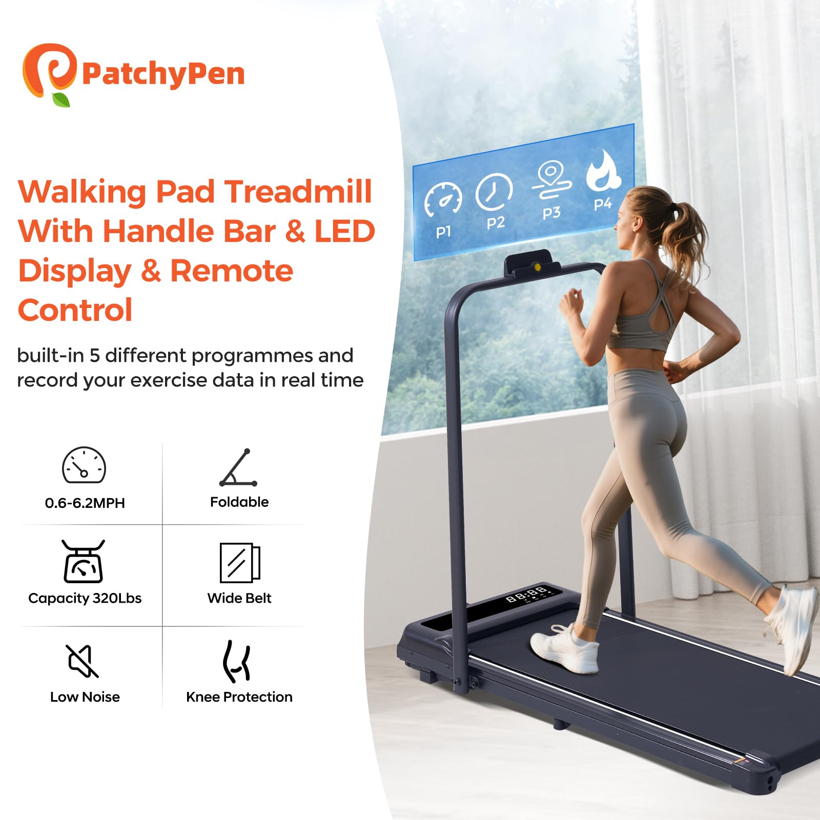 - 【Anti-Slip Runing Belt & Shock Reduction System】PatchyPen treadmills for home small is designed walking mat provide a 15.75'*35.43' spacious running area with a 6-layer anti-slip belt, 10 silicone shock absorbers and 2 shock absorb cushions, it helps to shock absorbing and noise reducing, making your running quieter and more stable, it reduces the impact on your body, ensuring knees, muscles and joints protection during running