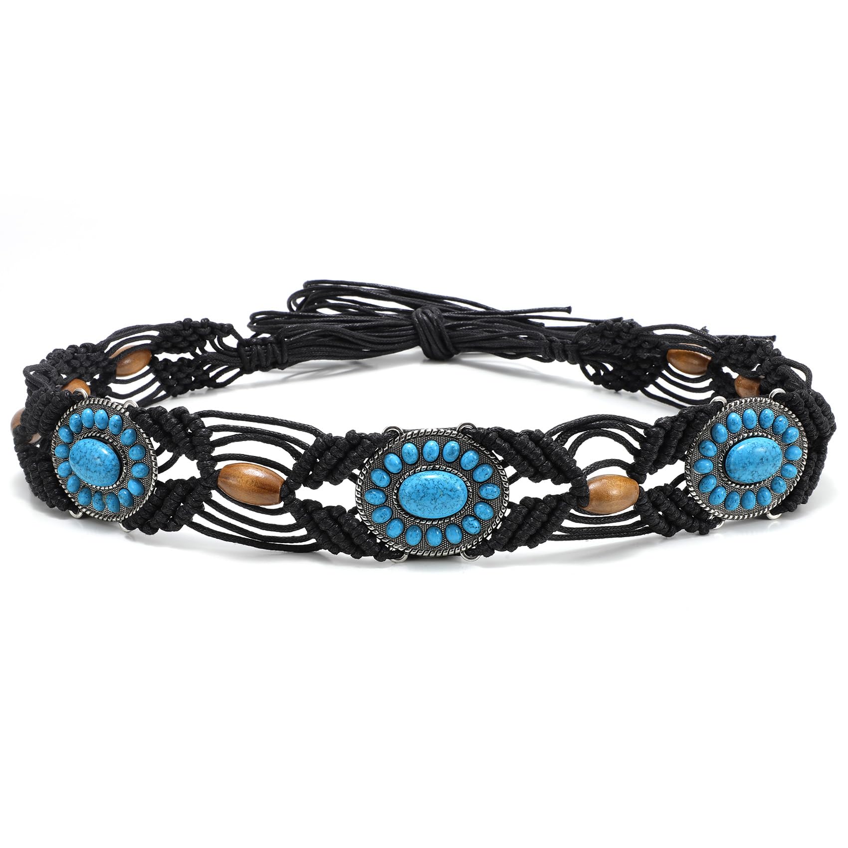 WHIPPY Boho Turquoise Belt for Women Wax Rope Braided Waist Belt Ethnic Western Hand-Woven Beaded Tassel Belts for Dress