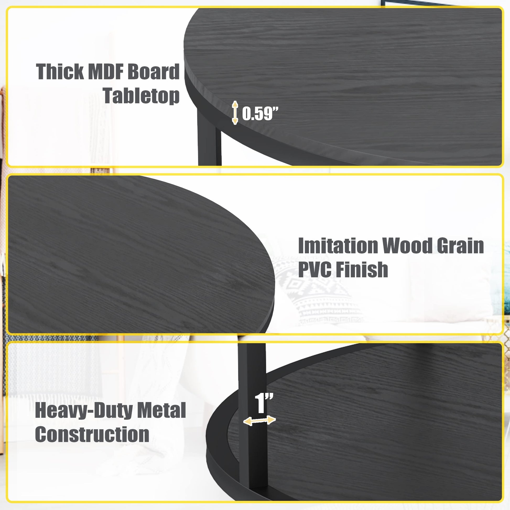 - Imitation Wood Grain Surface---The black wood grain PVC veneer finish has the look of being elegant and simple, giving it texture and a rustic homey appeal for our coffee table. Also, this round table is scratch-resistant, waterproof and easy to clean. No paint was needed, green non-toxic and Eco-friendly.