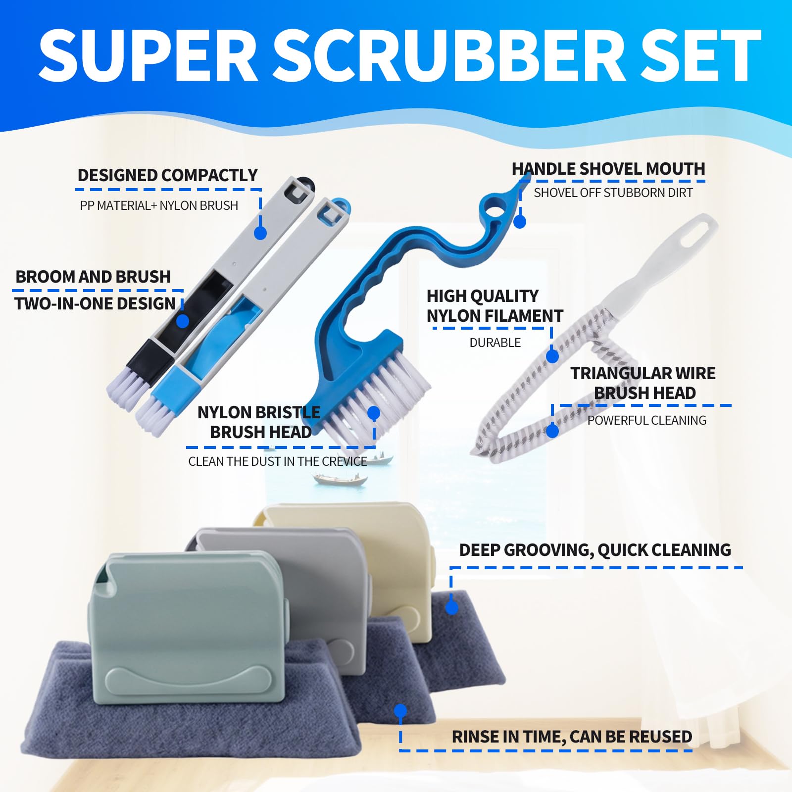 - Multifunction Window Cleaning Kit: Great group of crevice window cleaner tool includes 3 pcs track cleaning brush with 6 pcs replacement scouring pad, 2 pcs clean dustpan brush, 1 pcs window track cleaning brush, 1 pcs window shutter brush. Magic cleaning brush great for home, kitchen, office, restaurant, etc.