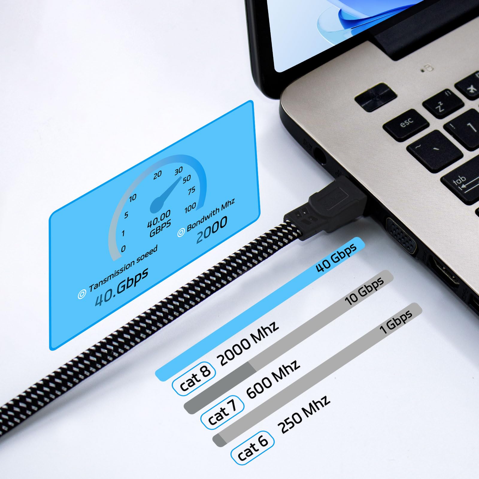 - 【40Gbps High Speed】Cat 8 ethernet cable supports data transfer speeds up to 40Gbps and 2000MHz bandwidth, faster than Cat7, Cat6 and Cat5, ideal for gaming and streaming, greatly improving upload and download speed, sound, image and resolution quality. Enjoy a super-fast Internet life with less lagging and lagging when surfing the web.