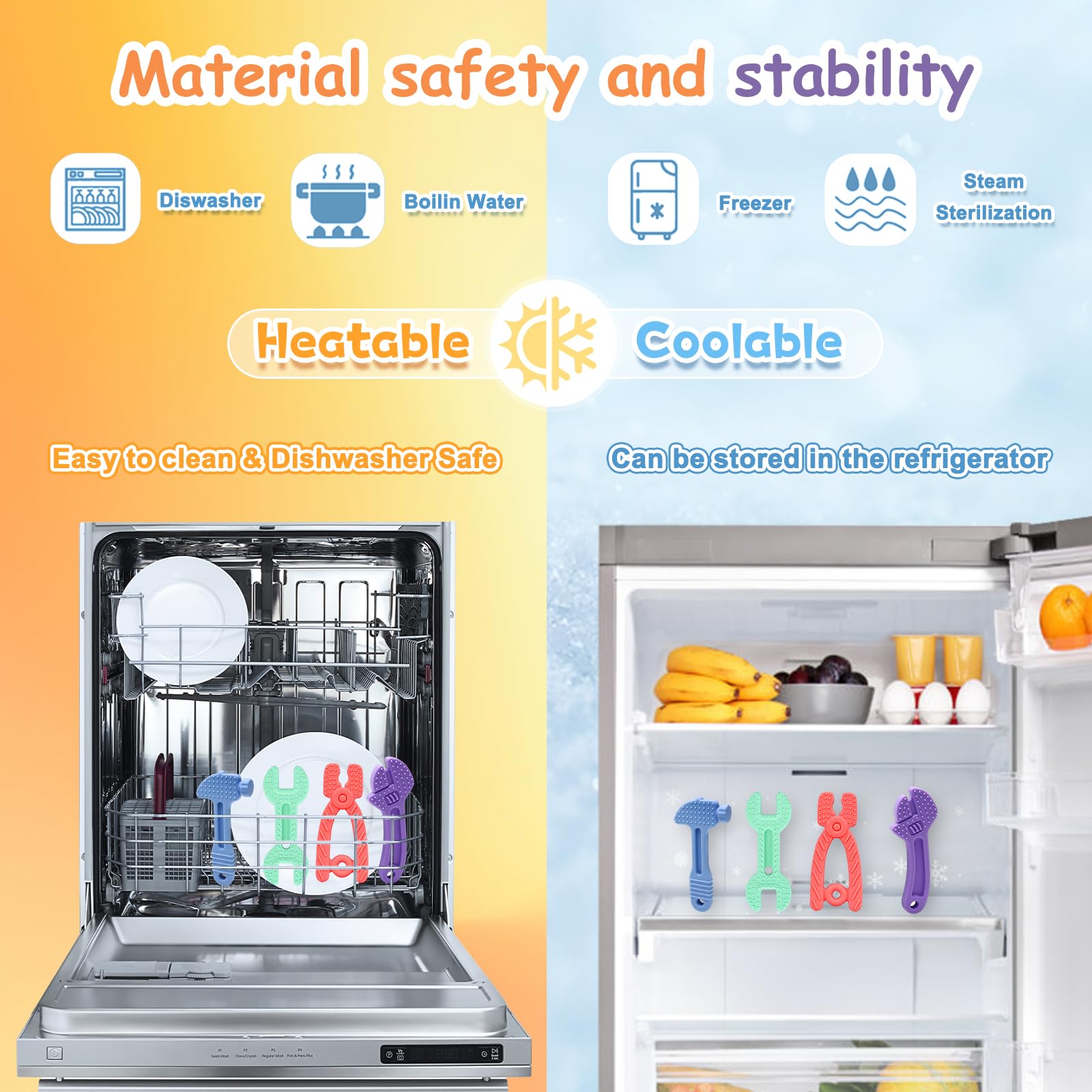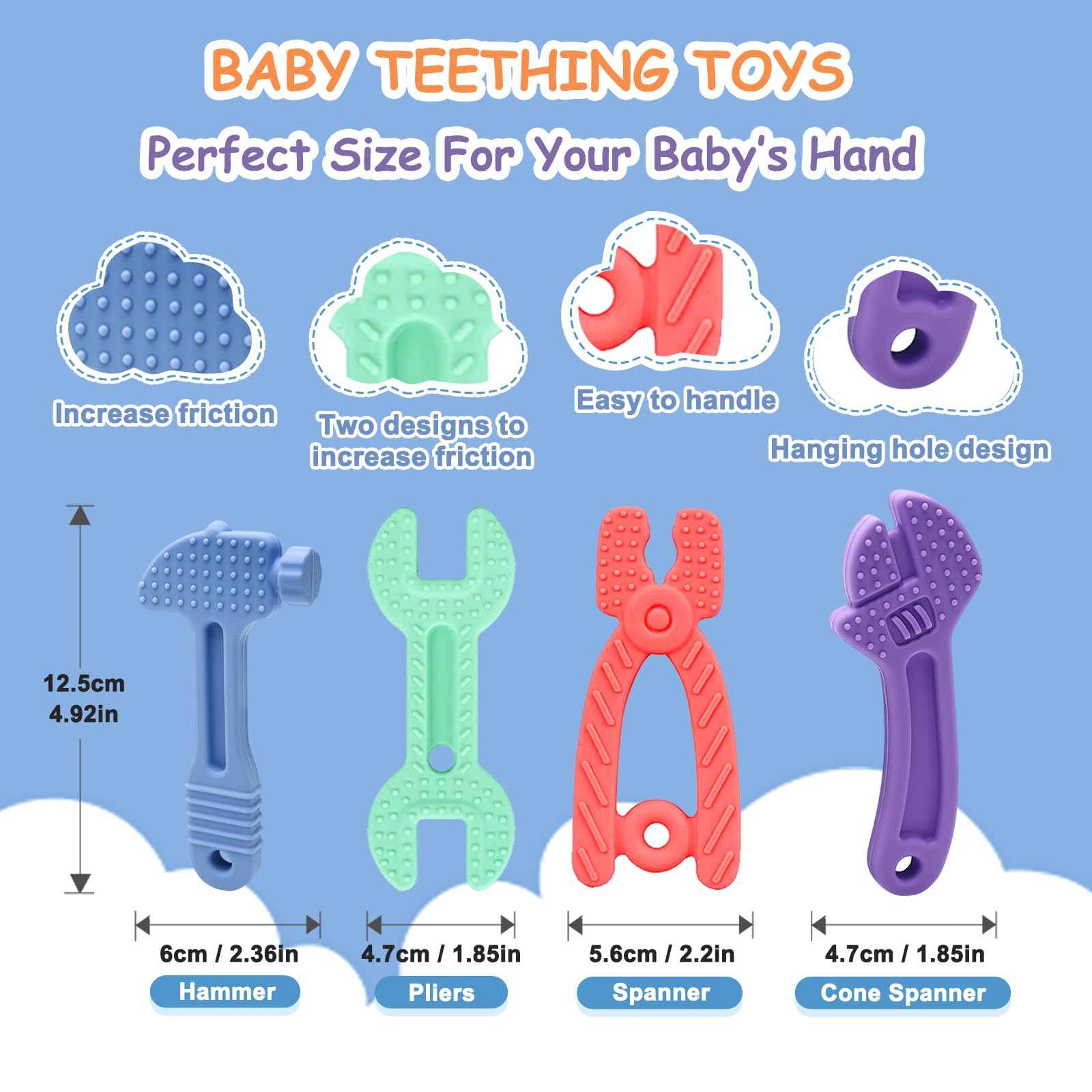 - BABY FRIENDLY DESIGN - Teething toys come in 4 different shapes: hammer, pliers, wrench, adjustable wrench, and are the perfect size for babies to grasp. Bright colors are easier to attract baby's attention. Soft and elastic, suitable for babies to chew