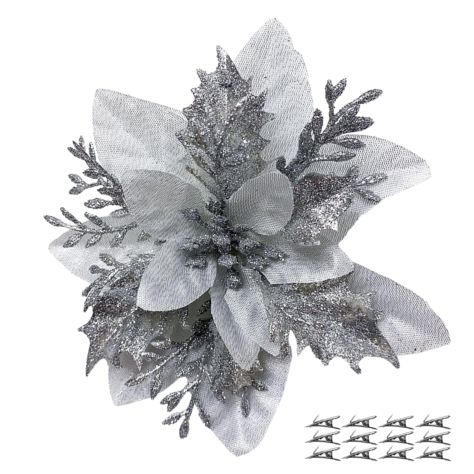 YUAGOLLE Christmas Artificial Poinsettia Flowers: 12pcs Silver Poinsettia With Clips Silk Glitter Picks Fake Floral, For Decorations, Xmas tree decor, Wreath Garland Bulk, Wedding, New Year ornaments.